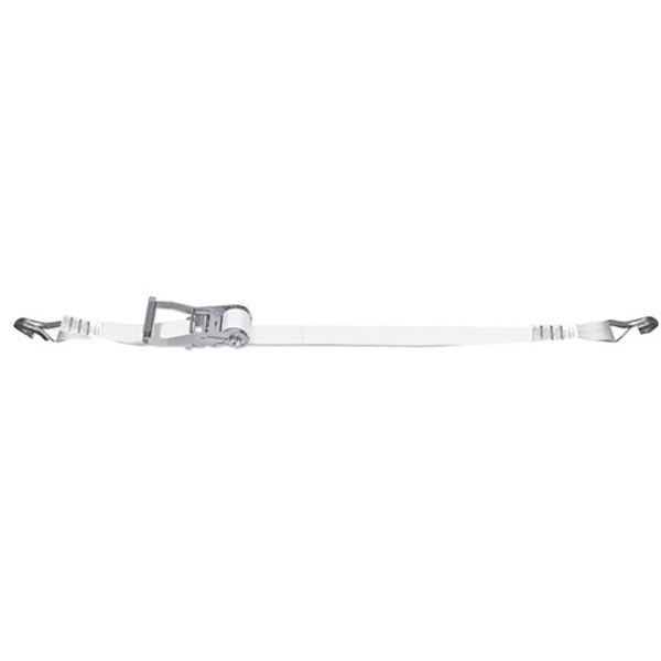 White, heavy-duty, coated polyester webbing and silver chromate-coated hardware Working Load Limit of 1,000 lbs / 453.6 kgs br> Long/Wide handle ratchet design features a double J-hook design br>