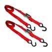 1"X6' cam buckle tie-down has the strength you need to reliably help you get your motorcycle or other recreational vehicle to your destination quickly and safely. Very easy to use, this tie-down can secure motorcycles and other types of cargo up to 400 lbs, keeping a steady and secure grip on them throughout transit. Our 1-in. standard zinc coated cam buckle offers quick tensioning that you completely control, allowing you to decide exactly how tight or how loose you need the 1-in. red polyester webbing to be. Just pull the webbing to tighten and press the lever to loosen. The pair of durable vinyl coated steel S-hooks create a reliable connection between the anchor point and the rest of the tie-down assembly. The 1-in. x 6-ft. cam buckle tie-downs are sold as eaches in cartons of 4 and come packaged for retail sale in a 2 pack clamshell.