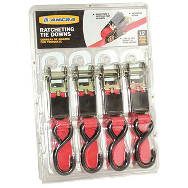 1" x 15' 4-pack 1" red strap with steel Ratchet Buckle and steel, vinyl-coated “S” hooks secures cargo and sport utilities including motorcycles, water craft and ATVs.