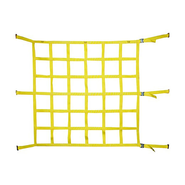 Heavy-duty 2″ polyester webbing with 9″ x 10″ openings. Has a 2,500 lbs. working load limit dependent upon track installation. Quick-release cam buckles and spring-actuated series E-fittings attached and adjustable width of 84”-96” with a 72” length.