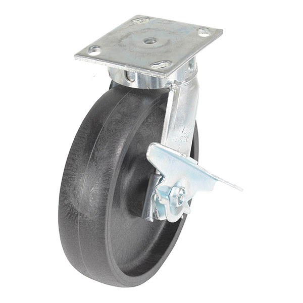 Made of high-tech proprietary glass filled nylon (RX). Provides better impact resistance than standard glass filled nylon. Does not absorb moisture like phenolic, and offers better floor preservation than steel or cast iron. Resists most chemicals, solvents, gases, acids and steam cleaning. Top plate measures 4 x 4-1/2". Black tread color. 85 (+/-5) Shore D. Wheel core material is glass filled nylon. .