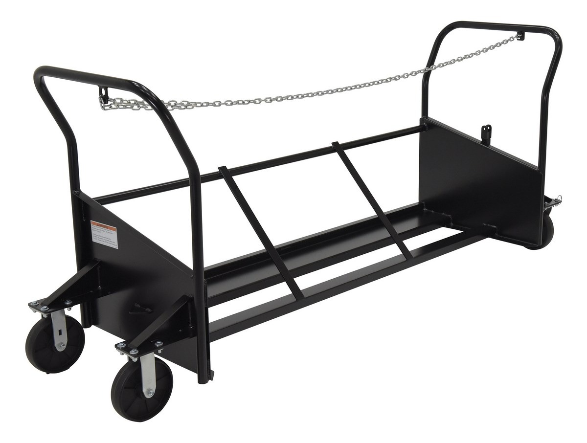 Heavy-duty steel cart hauls up to three trash cans at once—perfect for industrial or residential use. Features a safety chain, ergonomic handle, tow bar, hitch connection, and locking casters. Holds up to 95-gallon cans.
